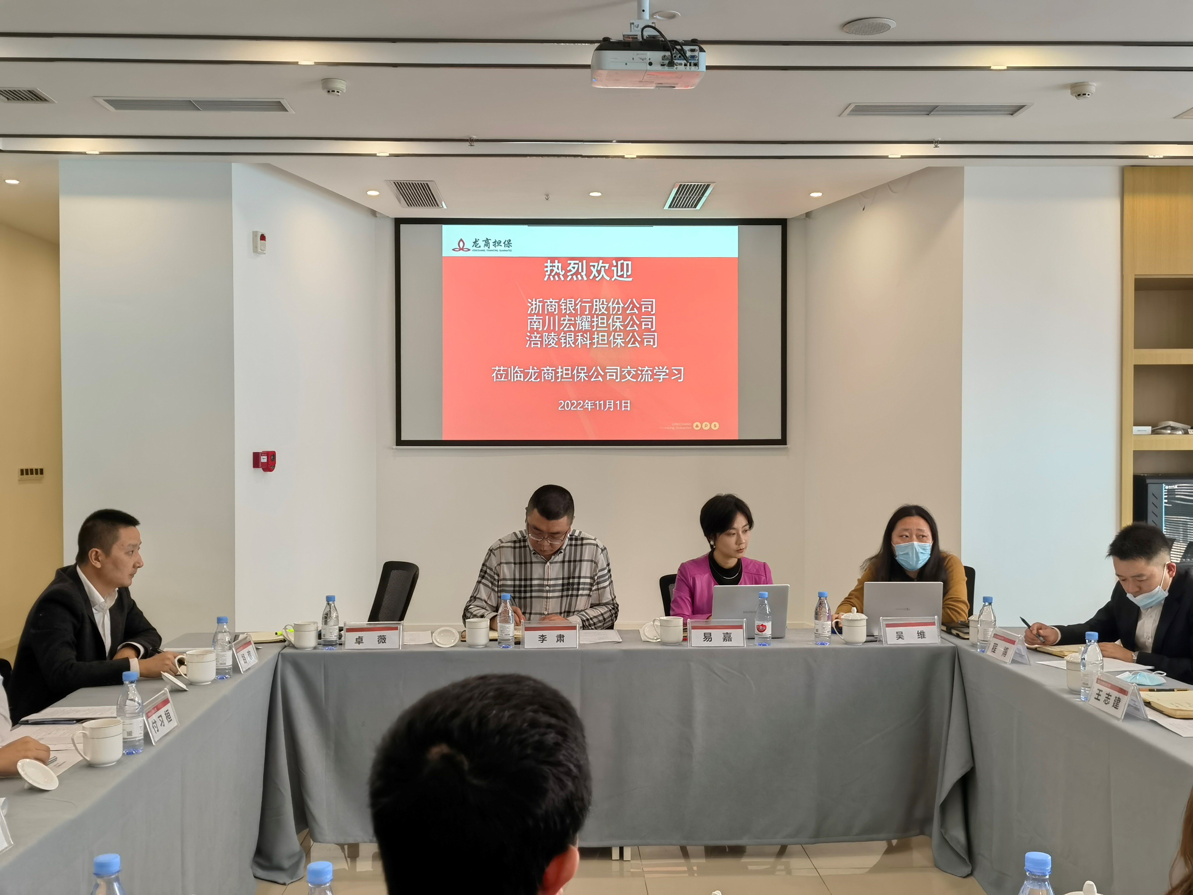 2022年11月1日上午,公司總經理付習桓在重慶龍商擔保公司5樓會議室,會同重慶龍商擔保公司、南川宏耀擔保公司與浙商銀行重慶分行就“總對總”批量擔保業(yè)務進行了座談交流。